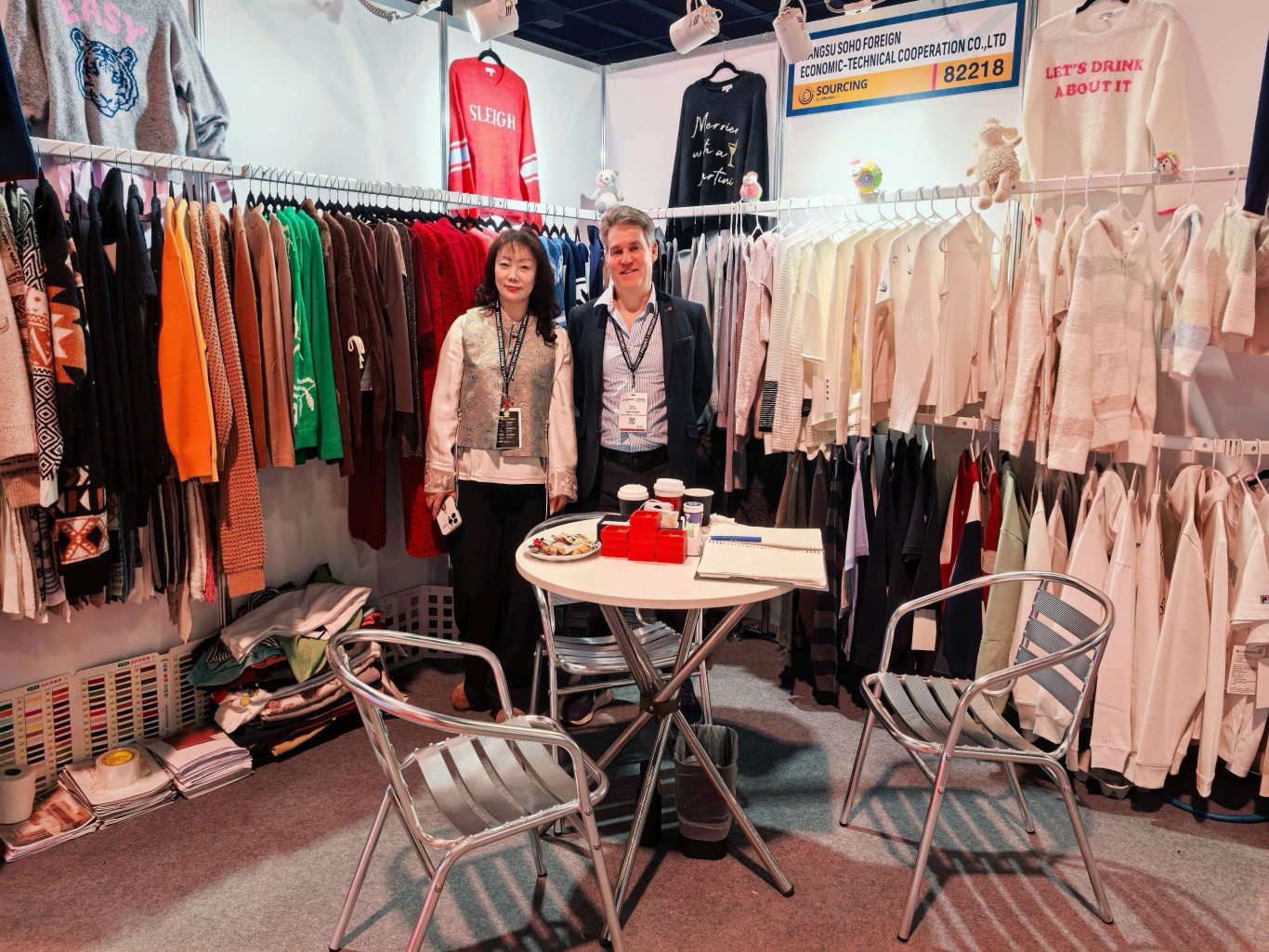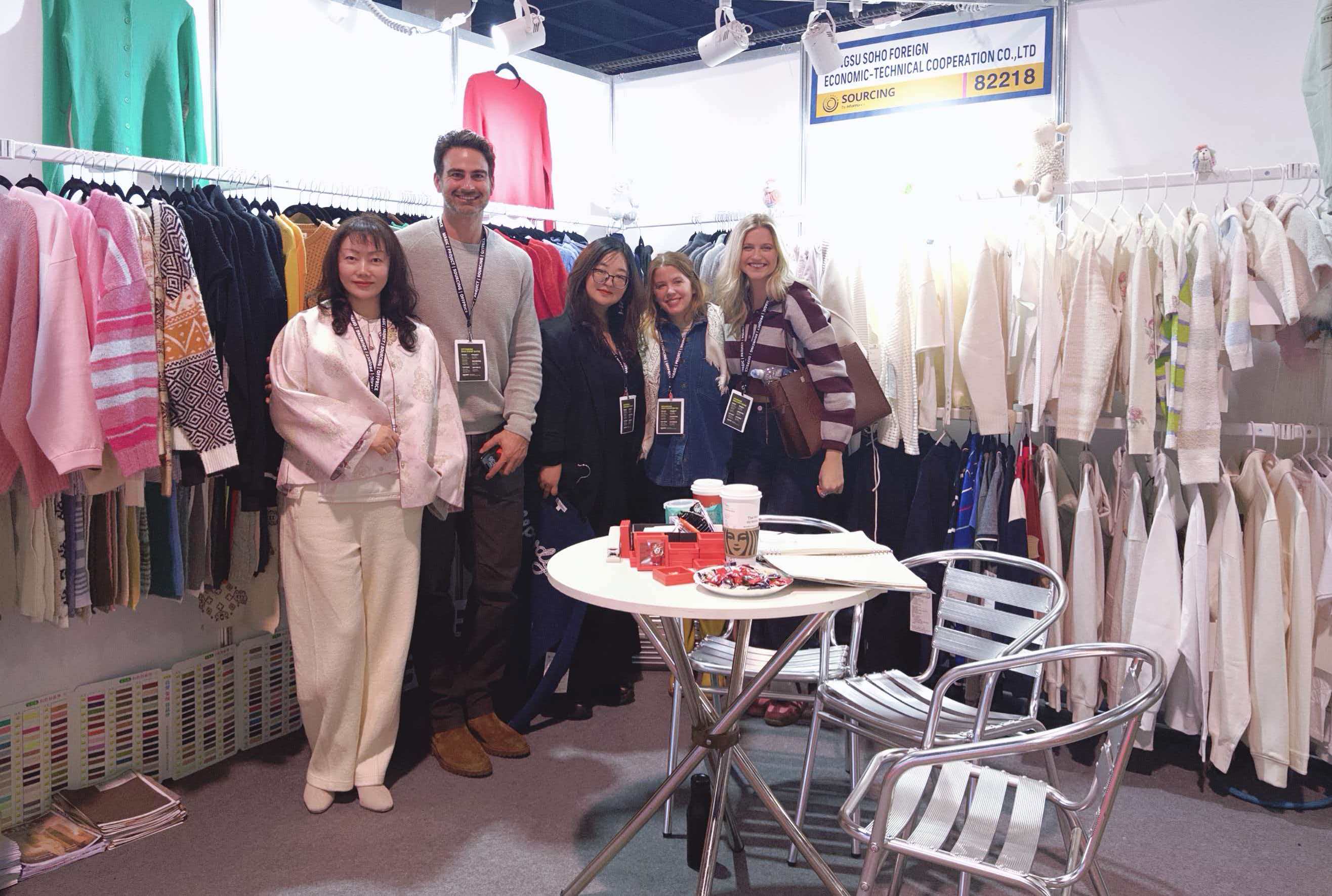 展会期间,公司重点展出以毛衫为主的针织服装,涵盖女士、男士、儿童款式,产品系列丰富、设计风格多元。团队成员以专业、高效、热情的服务形象,向来自美国、加拿大、英国等国家和地区的客商,系统推介产品优势与供应链保障能力,现场洽谈氛围热烈。